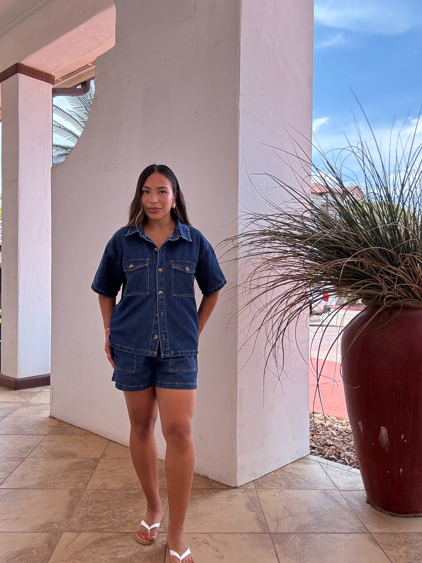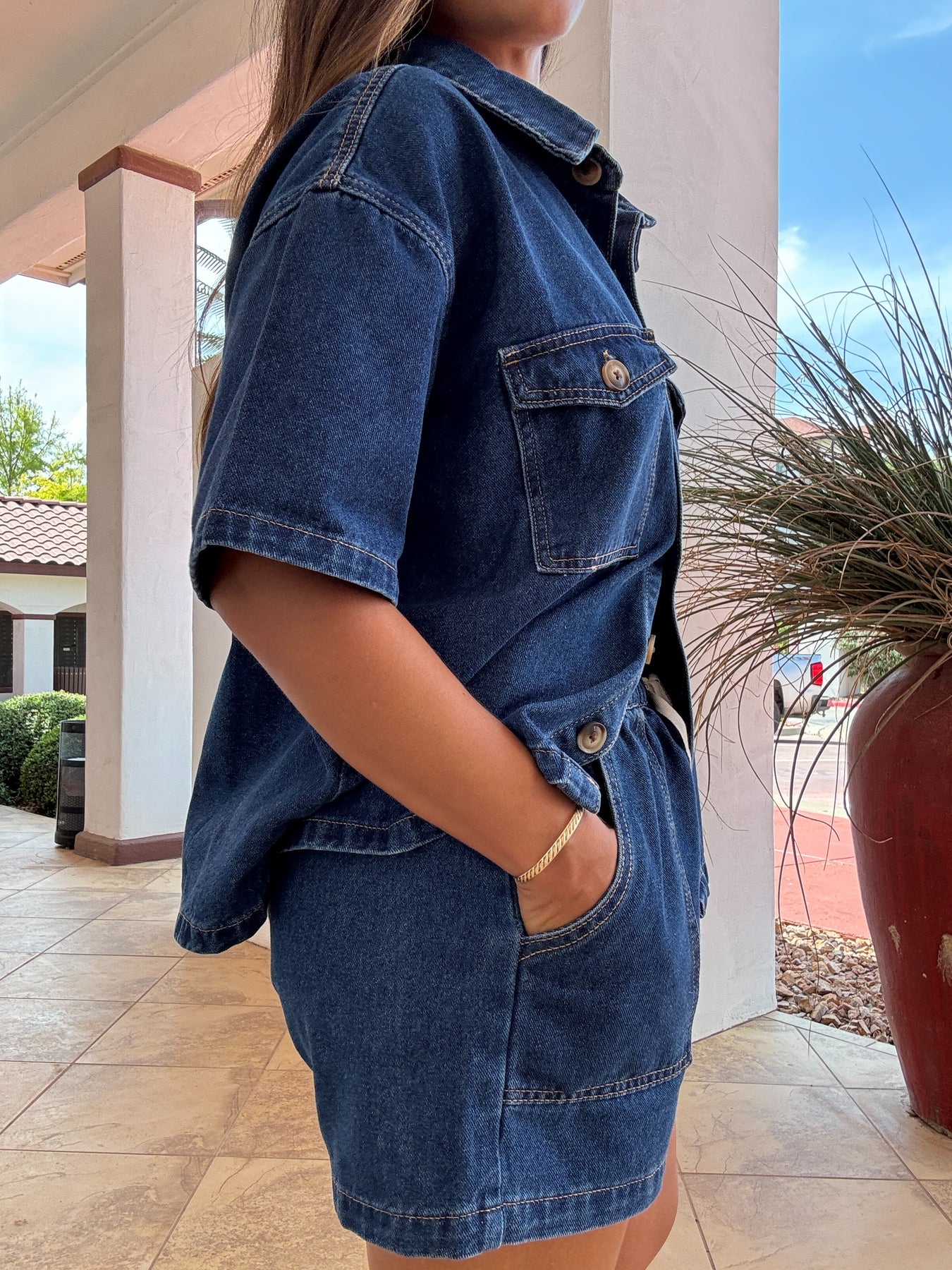 denim top features a collared neckline, front functional buttons, front chest pockets, and a loose fit