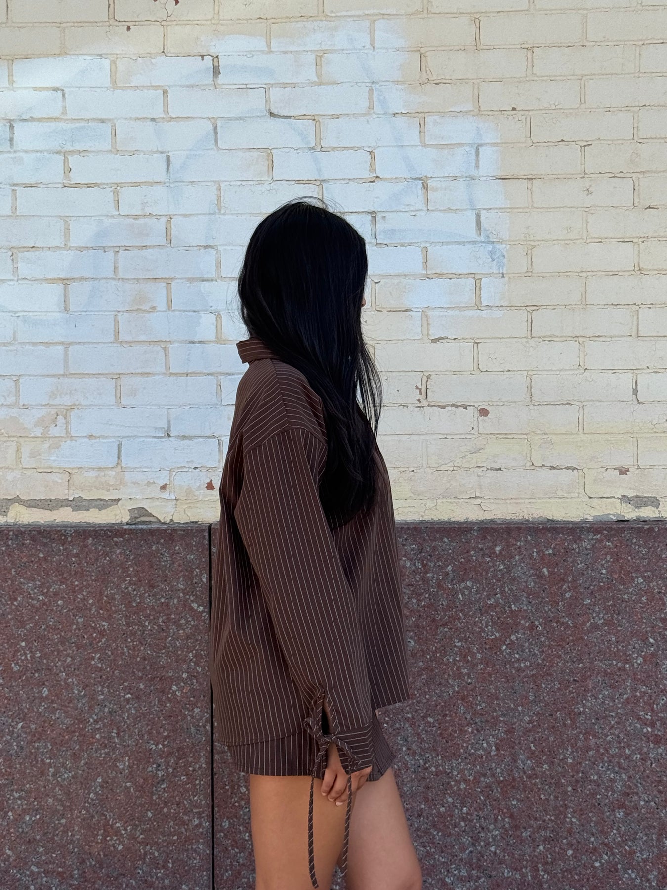 button down top features a collared neckline, front functional buttons, adjustable ties on both cuffs, and a loose fit.