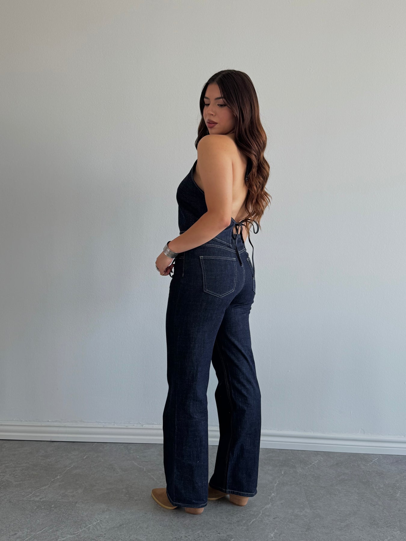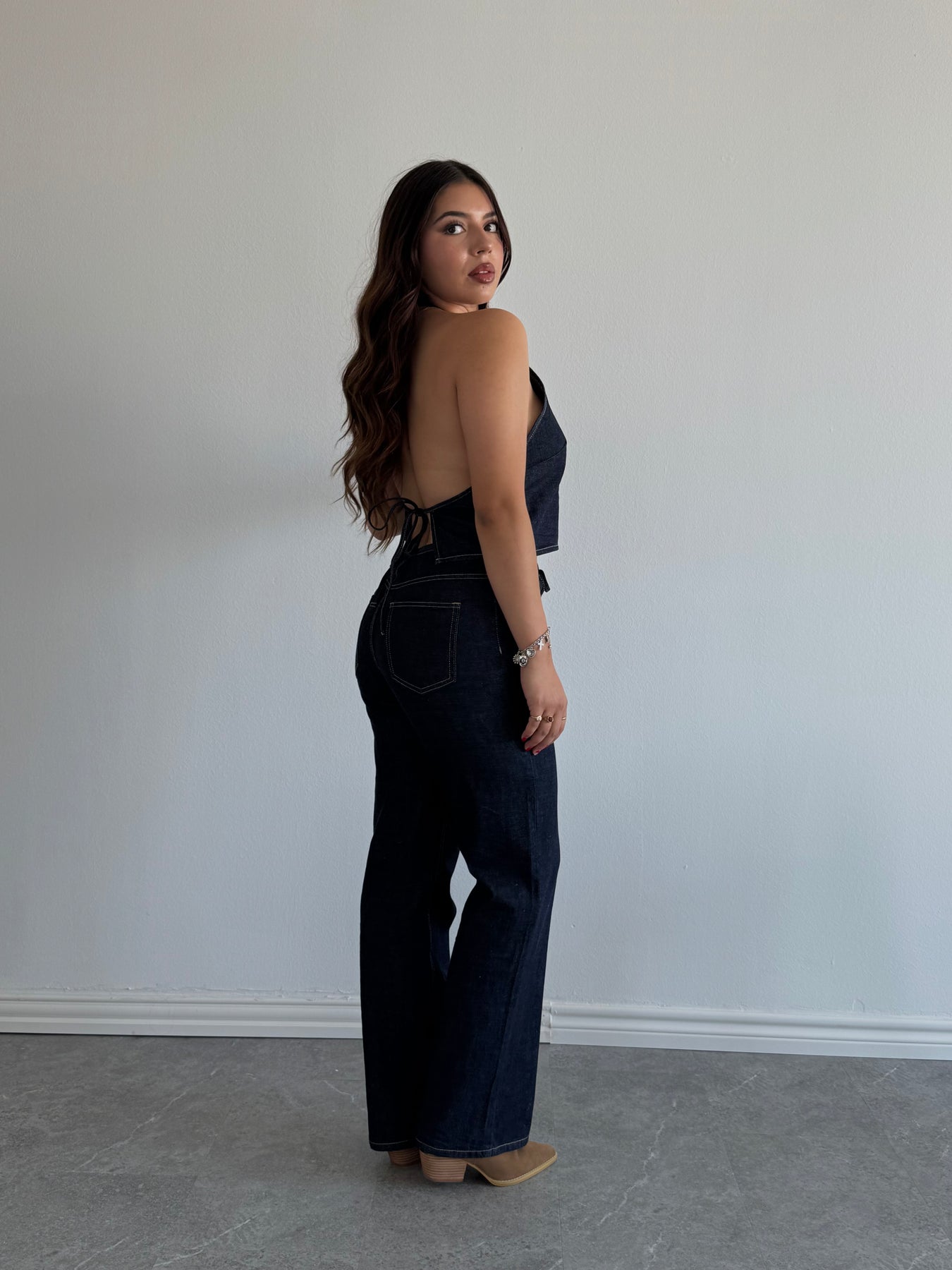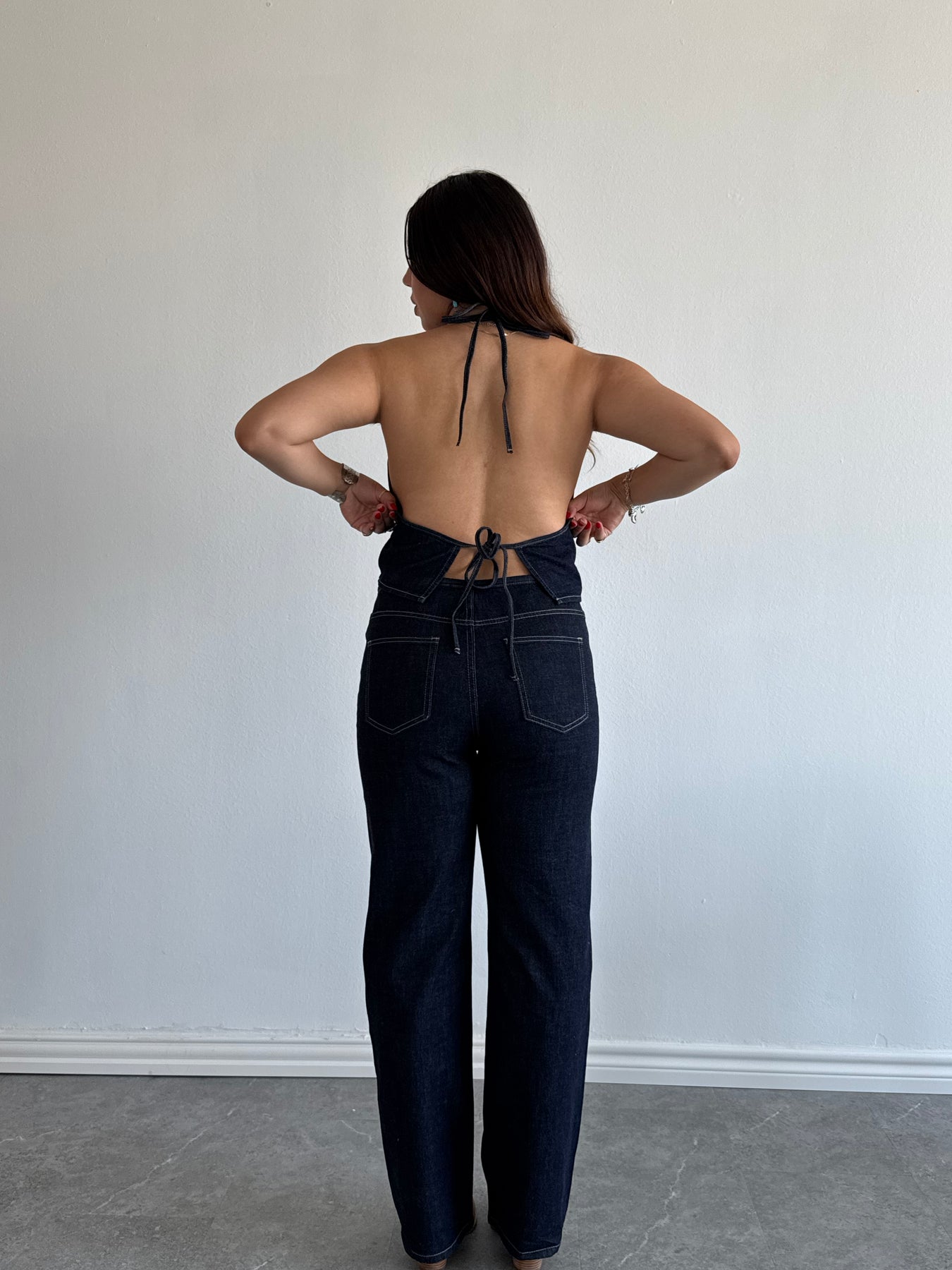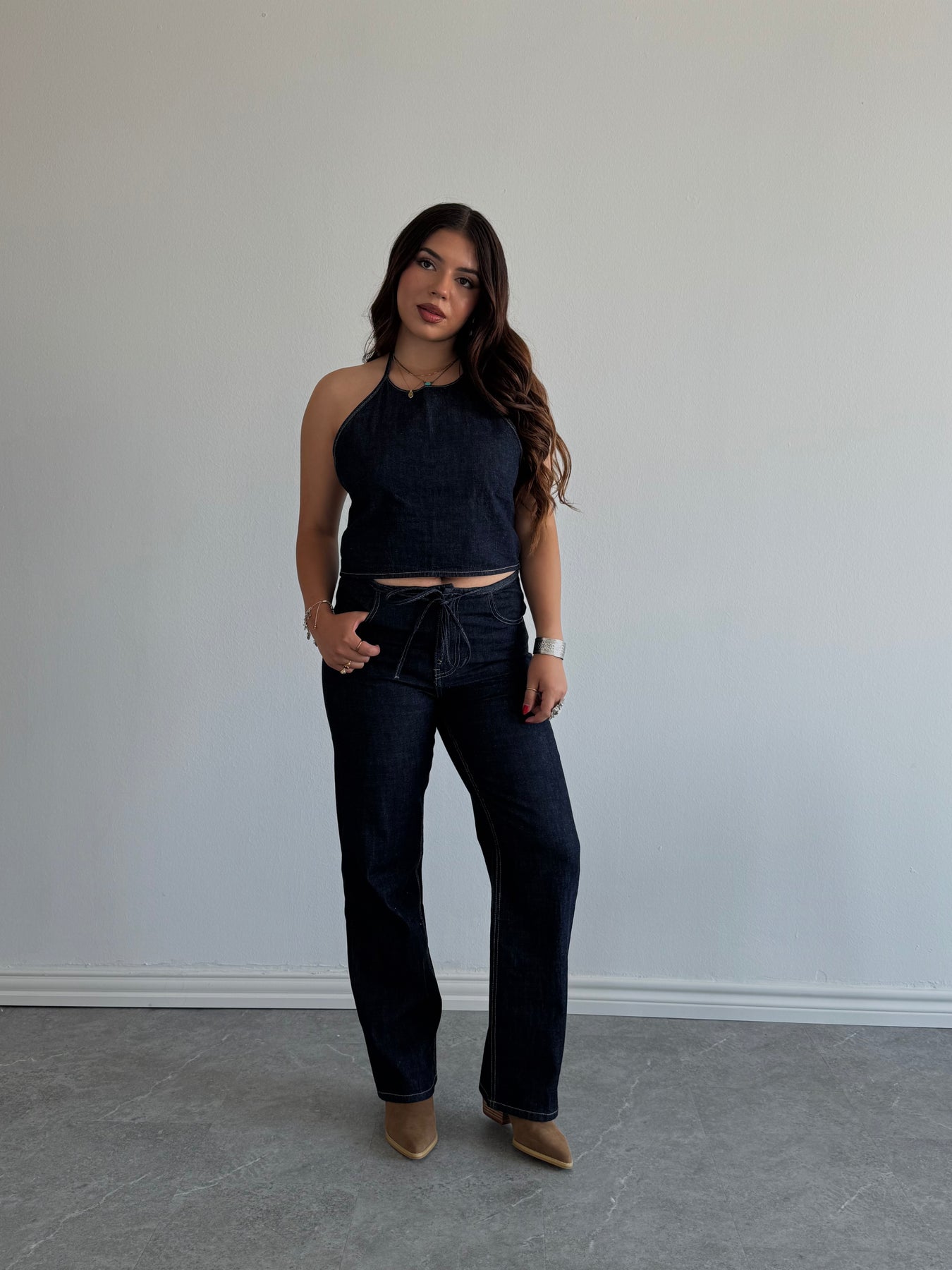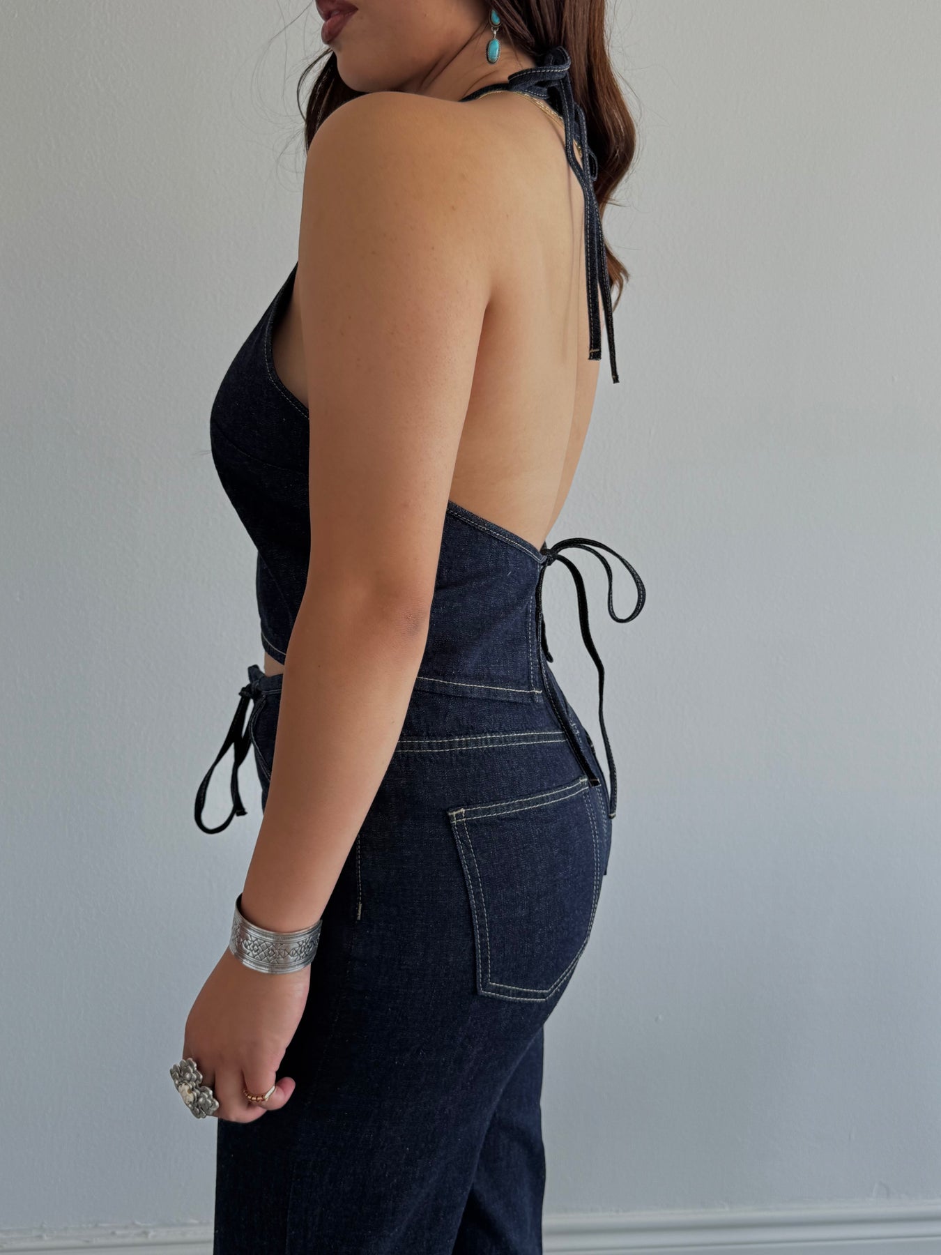 • halter top features an adjustable neck tie + an open back with an adjustable tie