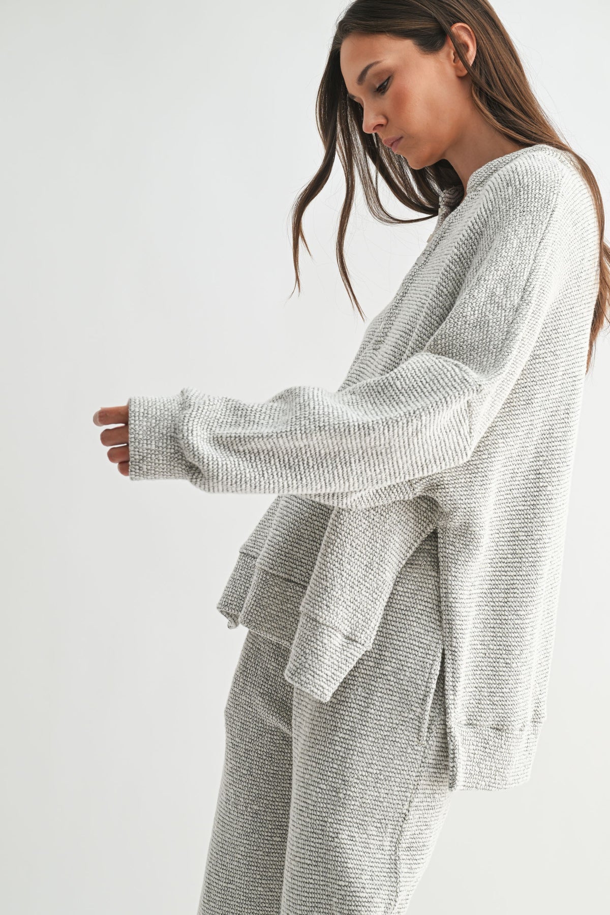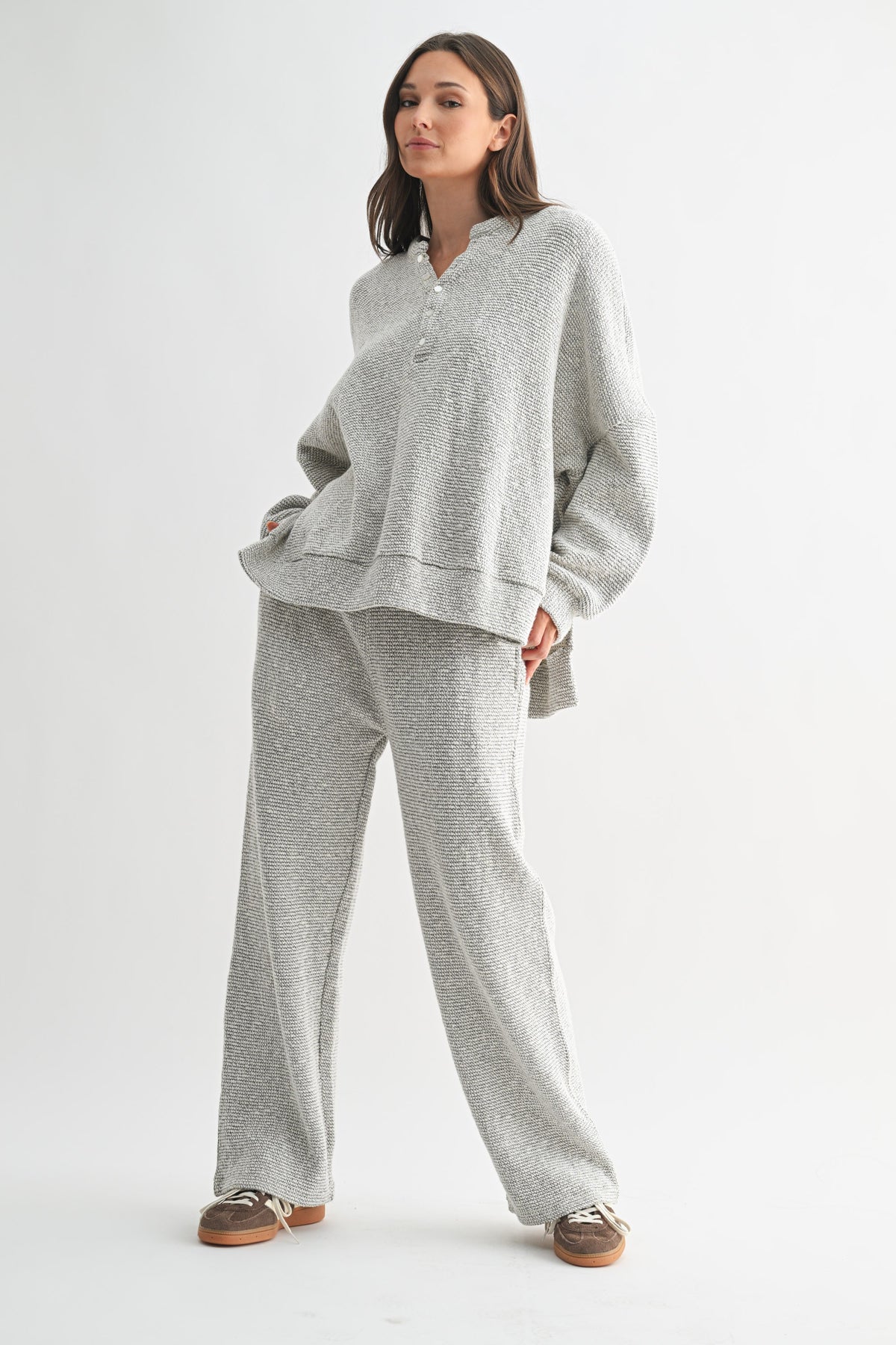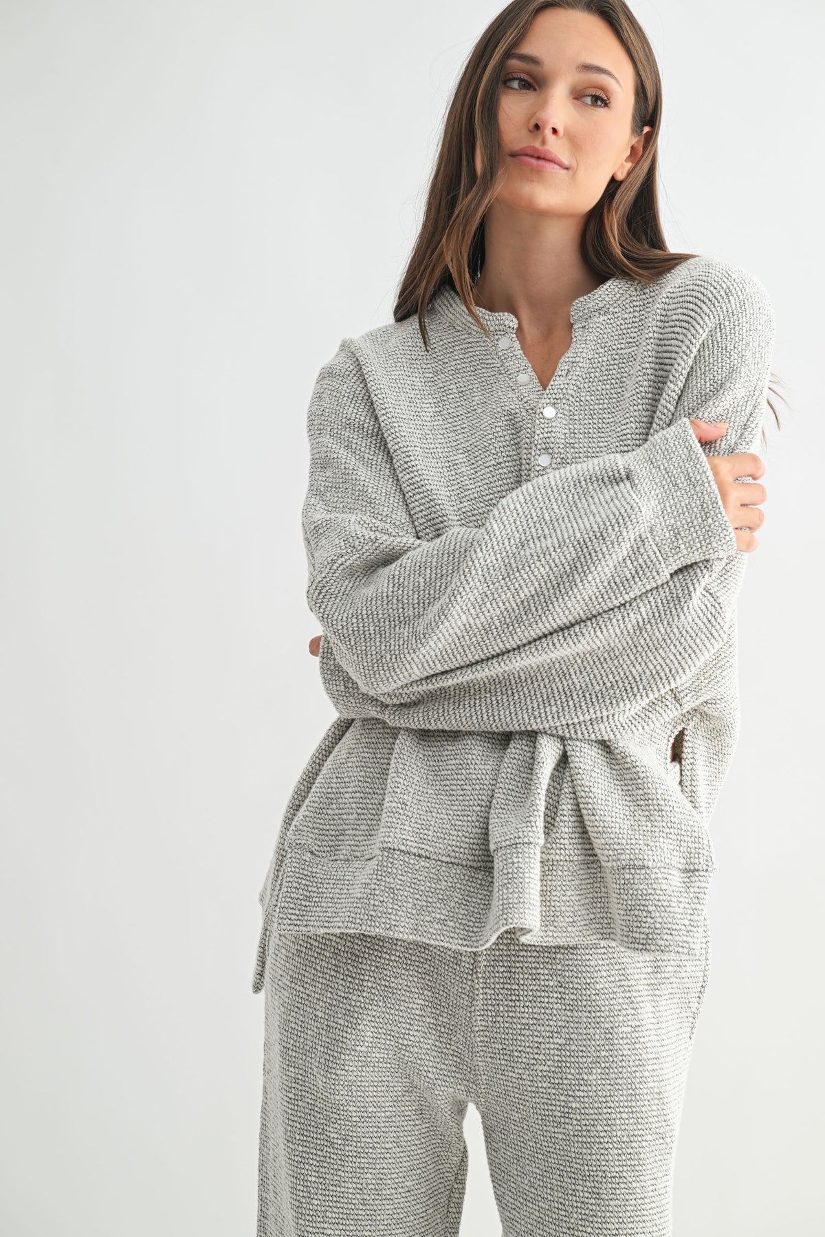 henley sweater features a oversized fit, functional button neckline, & a split hem